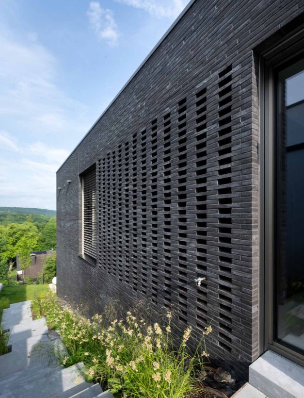 Til tross for den mørke fargen føles fasaden lett, takket være lag-på-lag-effekten i teglbåndene og store glassflater som bryter opp steinens tyngde. På hagesiden gir nøye plasserte åpninger – som en inntrukket loggia og bassengområde – dybde og kontakt mellom inne og ute.