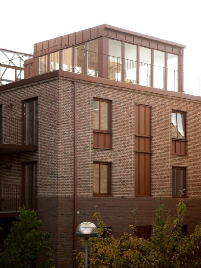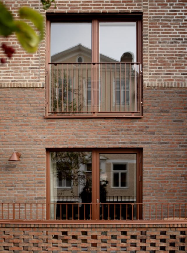 Tegldetaljer og variasjoner i fuger gir subtile effekter og lag av uttrykk. En lav balkong med «hit-and-miss»-tegl inspirert av eldre bygninger tilfører karakter.