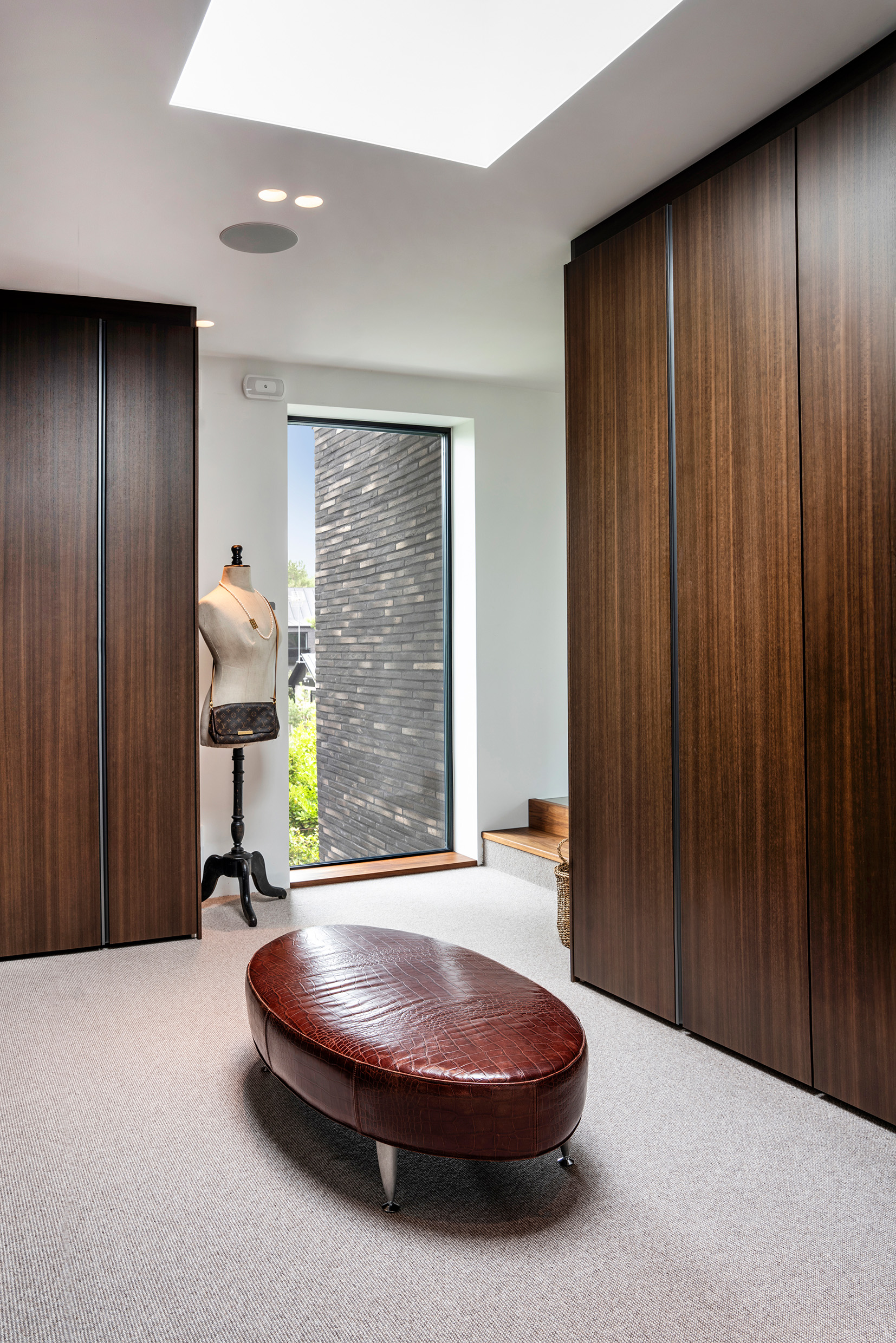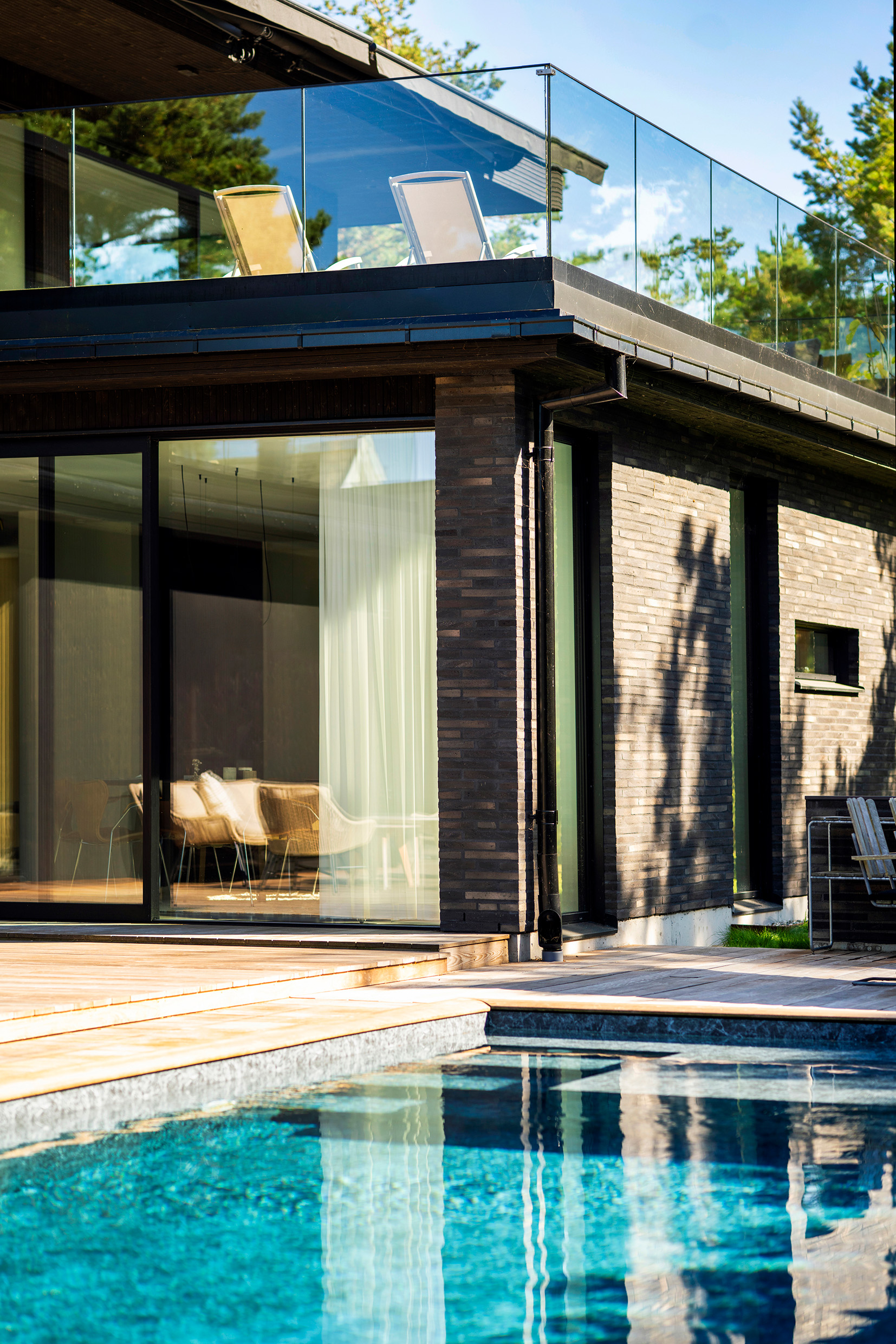 The experience of light in the house, throughout time and season, were important when placing openings in the walls. Light from different directions and possibilities to connect with the nature outside. The different volumes are articulated with large overhanging eaves which provides shadow in summertime. The combination of brick and wood paneling for the exterior was an intention from the beginning.