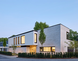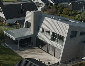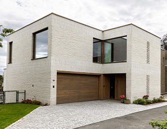 The bricks are light-tinted with a raw and coarse touch that adds a sand-coloured diversity to the finished masonry. The slightly retracted masonry joints have been chosen to bring out the brick’s rustic surfaces even more. This detail rich façade plays elegantly with panels lined with pre-patinated copper cladding and obliquely cut hardwood cladding on the front door and garage doors. A symphony of warm and natural materials that blends in perfect symphony.