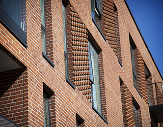 Innovative property in Aalborg City center with a distinct sloping façade. Randers Tegl assisted the performing contractor in designing and planning expansion joints, as well as suspension principles and determination of the masonry course according to the placement of brick bellows. The design of the façade posed special requirements for the building's carrying capacity.