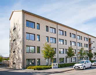 Apartment building in Sweden with bright light-yellow bricks that give a classic and modern look. 58 space-optimized apartments dwell in the outskirts of Uppsala with green recreative areas for inhabitants to enjoy.