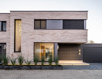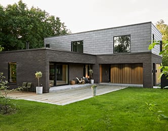 This stunning two-story German villa has fine horizontal lines with comforting overhangs made with dark Ultima-bricks. The floor plan extend the dining and relaxation areas outside sheltered from the element. Upstairs the everlasting summer nights can be enjoyed with a rustic backdrop of soft-moulded long format bricks. Combined with at lush flowering garden this villa has an inviting warm feel to it.